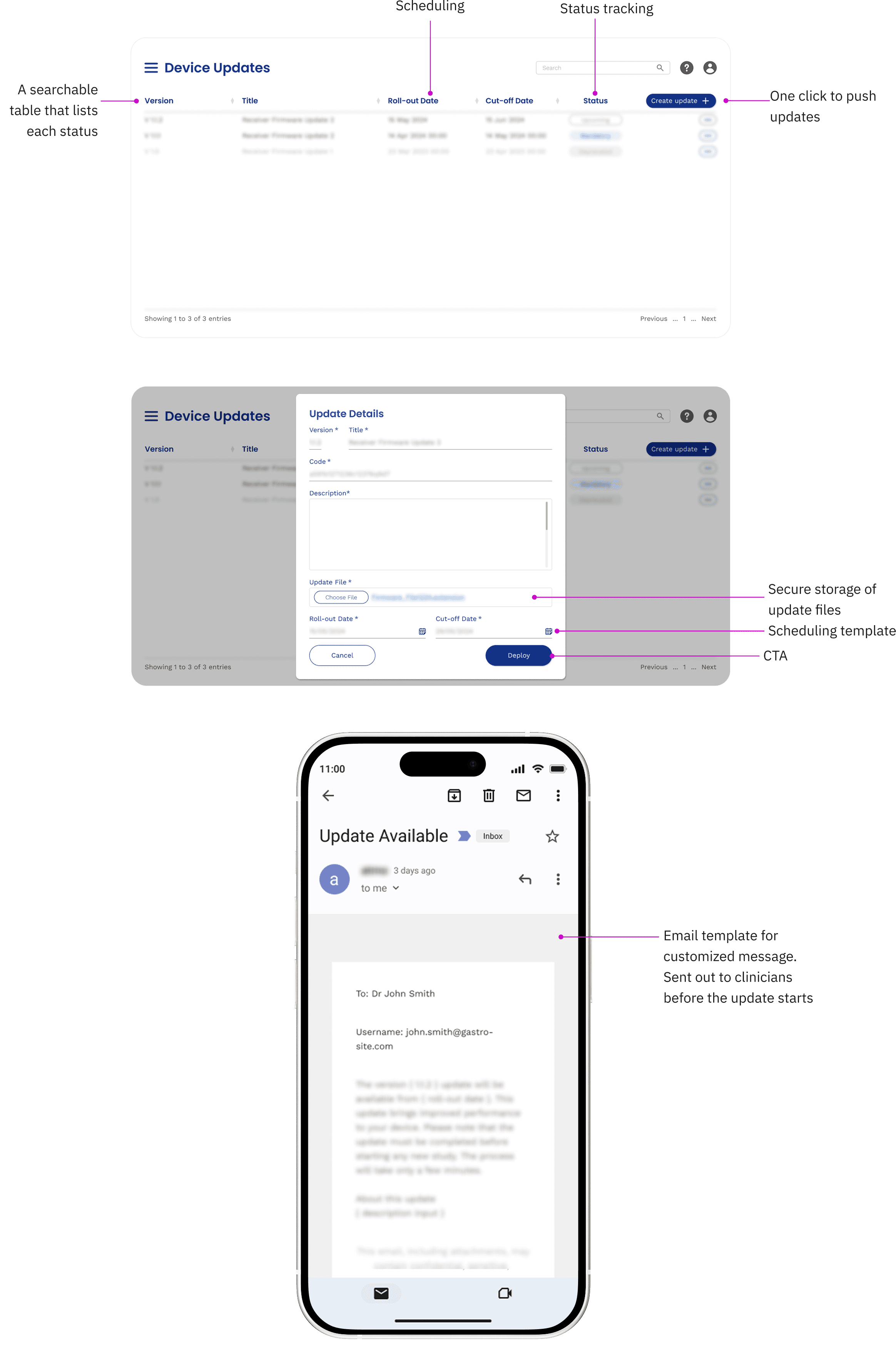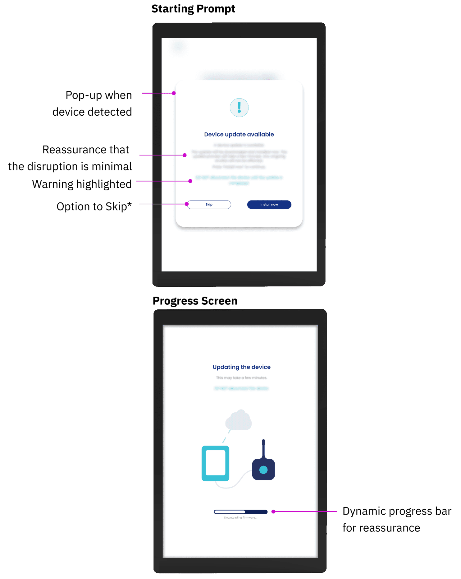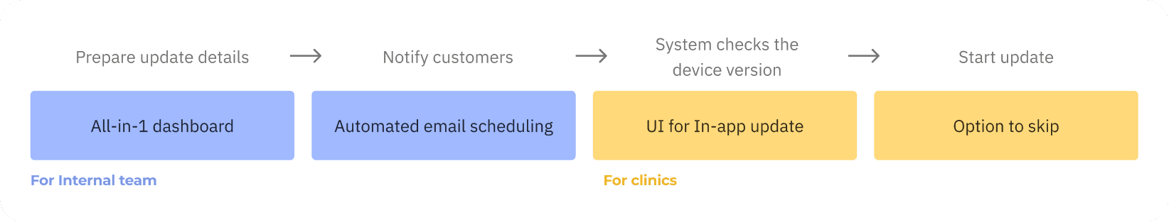 The existing device update process is burdensome for both the business and the clinic side. I designed a centralized platform for our team to organize updates, and a series of in-app prompts that significantly reduced disruptions for clinics during their daily patient consultation.