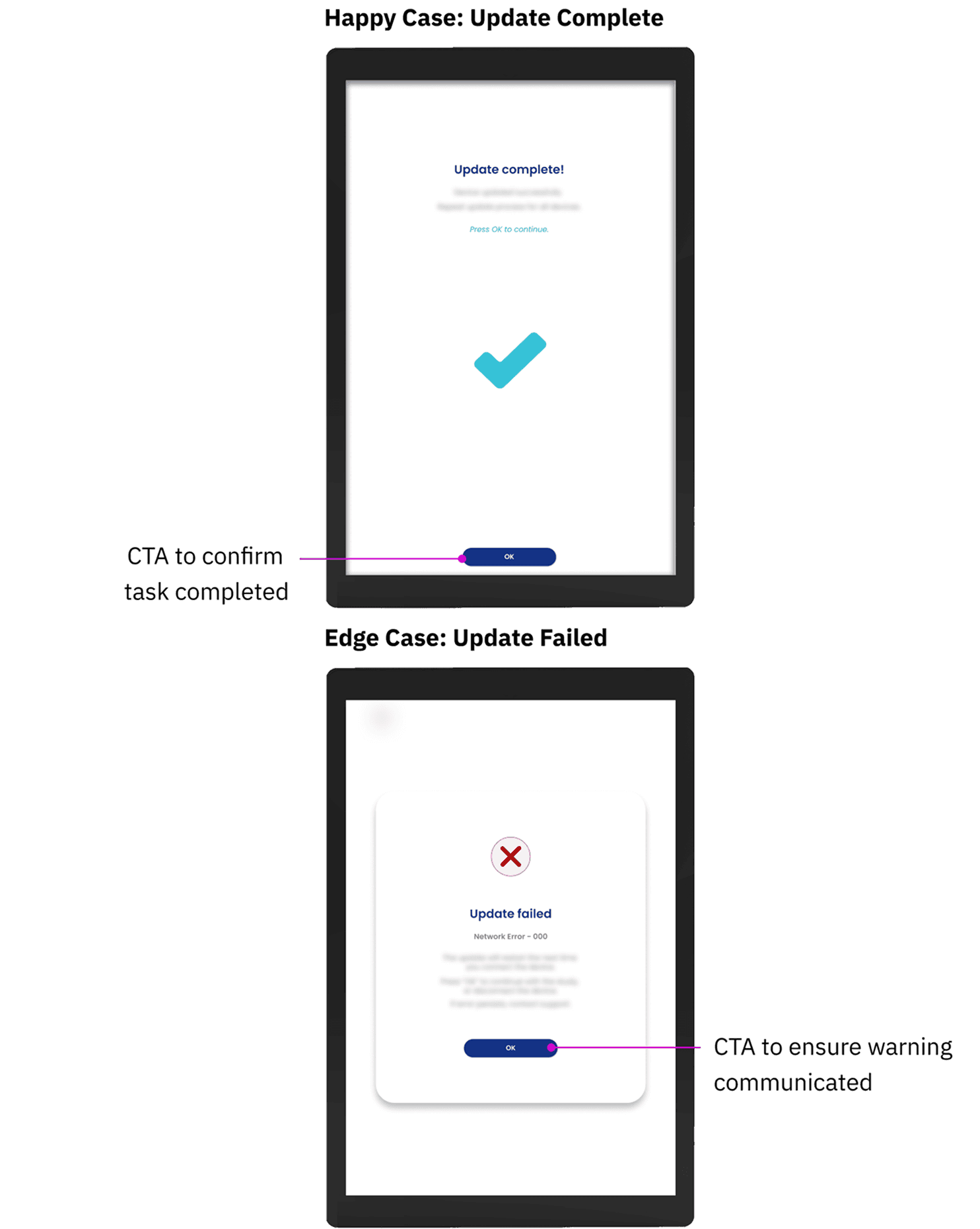 I conducted a gap analysis with our engineers and identified key inefficiencies in how updates were managed and distributed. This informed the design of a new dashboard enabling engineers to remotely push updates, while clinicians receive guided in-app prompts allowing them to complete the process with minimal disruption to their workflow.